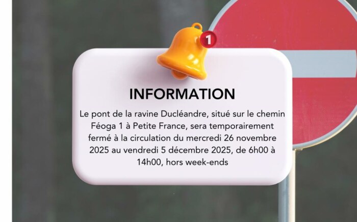 La Ville de Saint-Paul informe les usagers que le pont de la ravine Ducléandre, situé sur le chemin Féoga 1 à Petite France, sera temporairement fermé à la circulation du mercredi 26 novembre 2025 au […]