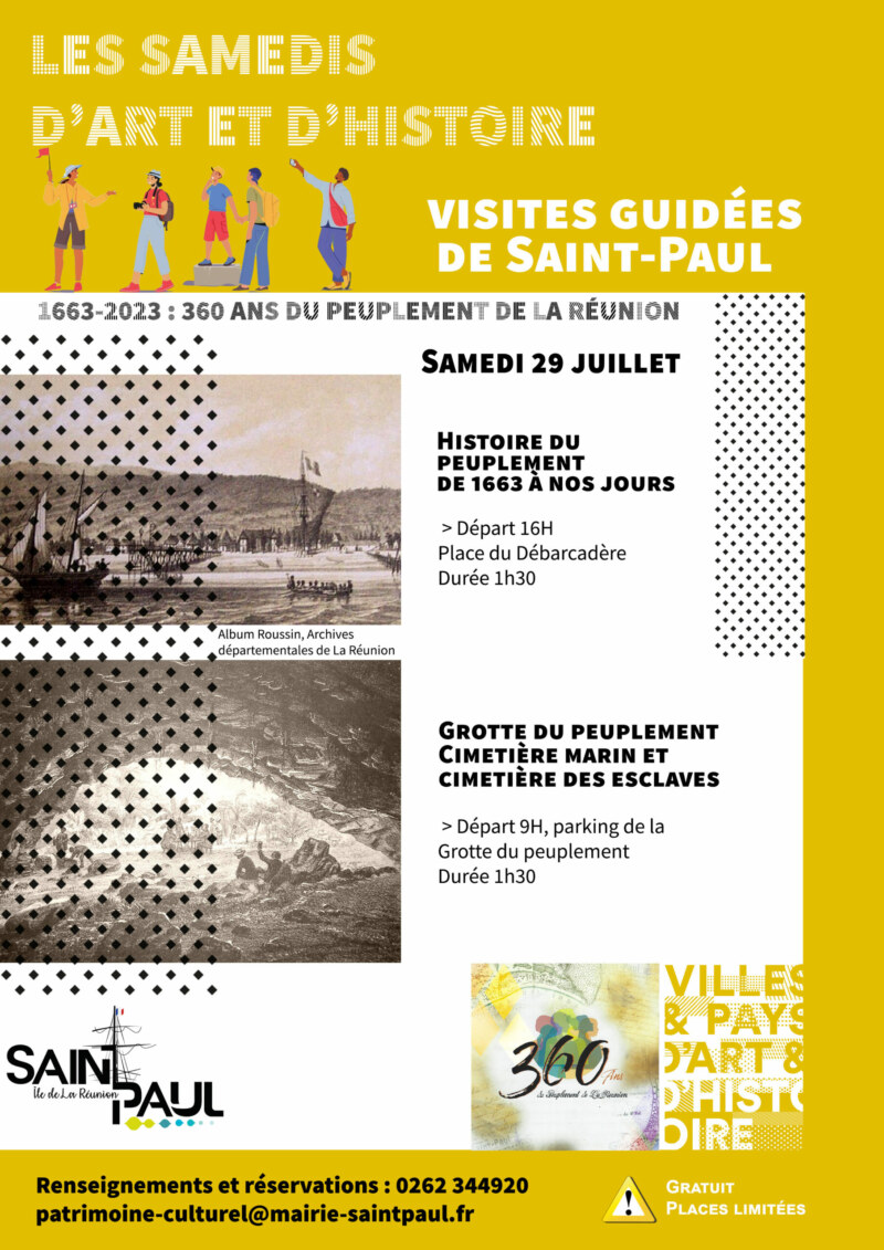 Dans le cadre de son label Ville d’Art et d’Histoire et du 360ème anniversaire du peuplement de l’île, la Ville de Saint-Paul vous invite à un voyage dans le temps à travers l’Histoire des sites emblématiques du patrimoine. Une fois par mois, les samedis d’art et d’histoire vous dévoilent les différentes facettes de notre culture. De la nature à l’architecture en passant par les personnages remarquables, venez (re)découvrir la richesse historique de Saint-Paul, berceau du peuplement de l’île. Visites gratuites, durée 1h30, réservation obligatoire.