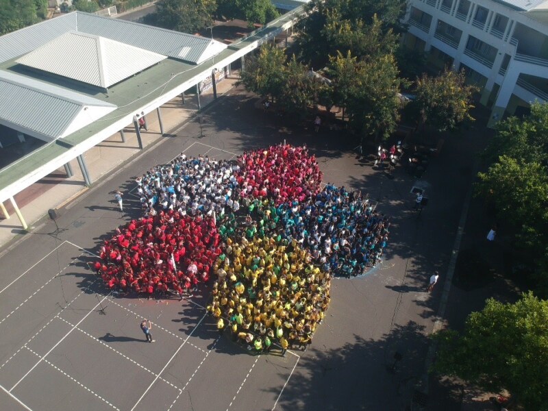 27 classes du collège de l’Étang et plusieurs classes des écoles primaires et élémentaires des environs, soit environ 1 000 élèves, étaient rassemblées ce jeudi 12 mai dans la cour du collège de l’Etang Saint-Paul. Formant une marguerite multicolore vue du ciel, les élèves ont interprété une “chanson pour l’Auvergnat” de Georges BRASSENS et l’hymne national ukrainien, “Chtche ne vmerla Oukraïna” (l’Ukraine n’est pas morte).