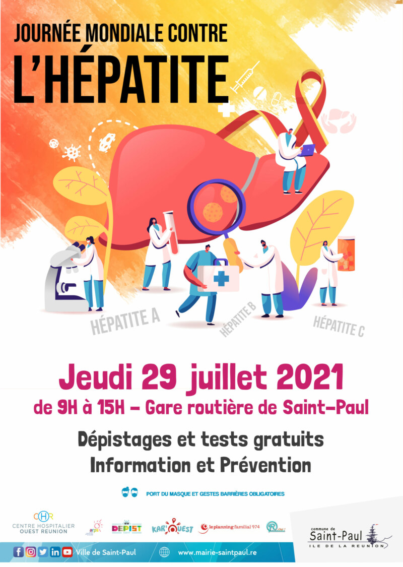 La Ville de Saint-Paul, labellisée “Ville Santé” s’engage pour la Journée Mondiale contre l’Hépatite ce jeudi 29 juillet 2021 de 9h à 15h. Rendez-vous à la gare routière de Saint-Paul !