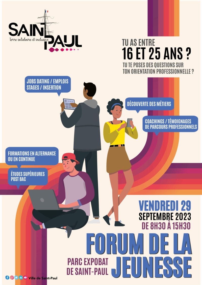 Tu as entre 16 et 25 ans ? Tu te poses des questions sur ton avenir professionnelle ? Rendez-vous au Forum de la Jeunesse le vendredi 29 septembre de 8h30 à 15h30 au Parc EXPOBAT de Saint-Paul.