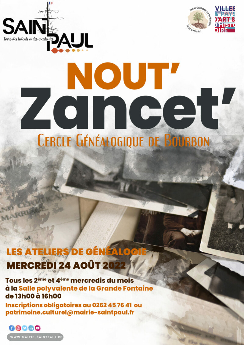 Tenu par le cercle généalogique de Bourbon, “Nout zancet'” est un atelier de généalogie proposé au grand public. Une action soutenue par la ville de Saint-Paul, ville d’Art et d’histoire, qui s’installe dans le quartier de la Grande Fontaine à la Salle Polyvalente tous les 2ème et 4ème mercredis du mois de 13h à 16h. La toute première session débutera ce mercredi 24 août, pensez donc à vous inscrire au 0262 45 76 41 ou sur le patrimoine.culturel@mairie-saintpaul.fr. “Connaitre ousa nou sort’, pou connaitre ousa nou sava”, n’est-ce pas là l’éternelle question que nous nous posons tous?
