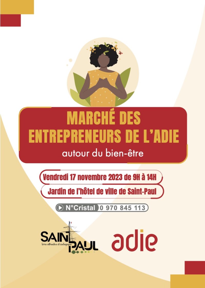 Rendez-vous le vendredi 17 novembre 2023 de 9h00 à 14h00 au Jardin de l’Hôtel de Ville de Saint-Paul pour le marché des entrepreneurs. Organisée par l’ADIE, cette manifestation aura pour thématique “le bien-être”.