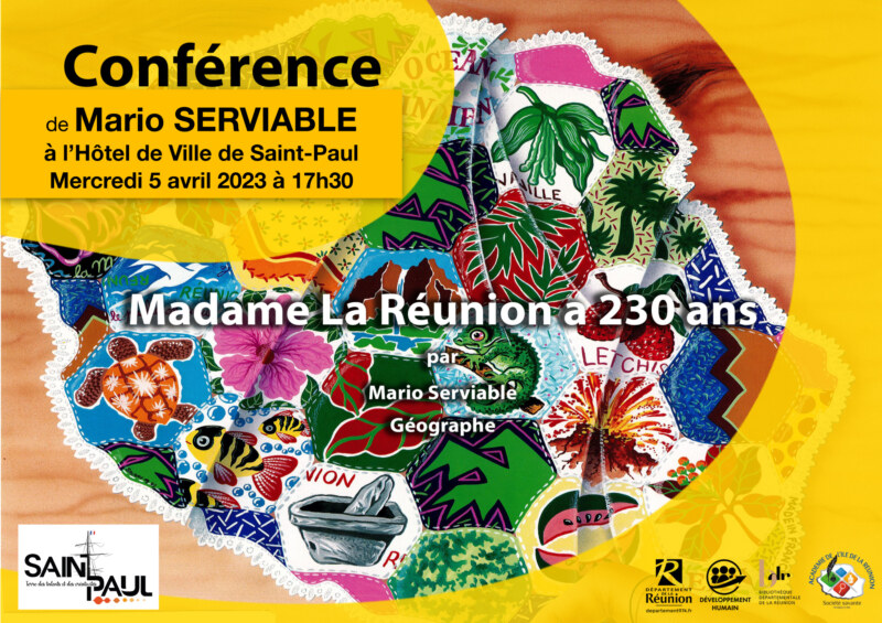 La Ville de Saint-Paul et l’Association des Membres de l’ordre des Palmes Académiques (AMOPA), en partenariat avec le Comité Ouest de la Société des Membres de la Légion d’Honneur (SMLH) vous invitent à la conférence de Mario Serviable, géographe. Baptisée “Madame La Réunion a 230 ans”, cette conférence se déroulera le  Mercredi 5 avril 2023 à 17h30 dans la salle duConseil Municipal de l’Hôtel de Ville de Saint-Paul. À cette occasion, le clip inédit “Lettre à ma dame” de Madeleine GAZE sera projeté.