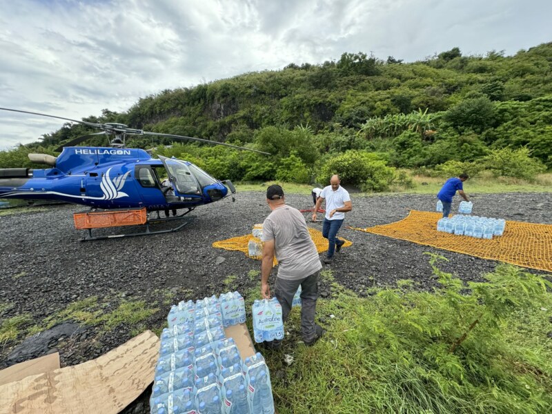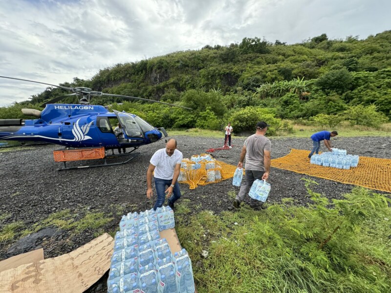 À 9h00, un hélicoptère a décollé de la piste de la Rivière des Galets pour acheminer plus de 1 000 bouteilles d’eau.