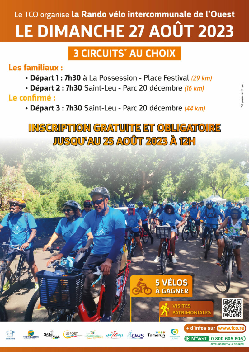 Cette année, le TCO, en partenariat avec l’OMS de la Ville de Le Port, la ville de Saint-Paul, la SPL Tamarun et l’Office du Tourisme Intercommunale de l’Ouest (OTI) présente sa rando Vélo Intercommunale qui sillonnera tout le territoire de l’Ouest ! Le top départ, prévu le dimanche 27 août 2023 dès 7h30, 3 parcours sont organisés.