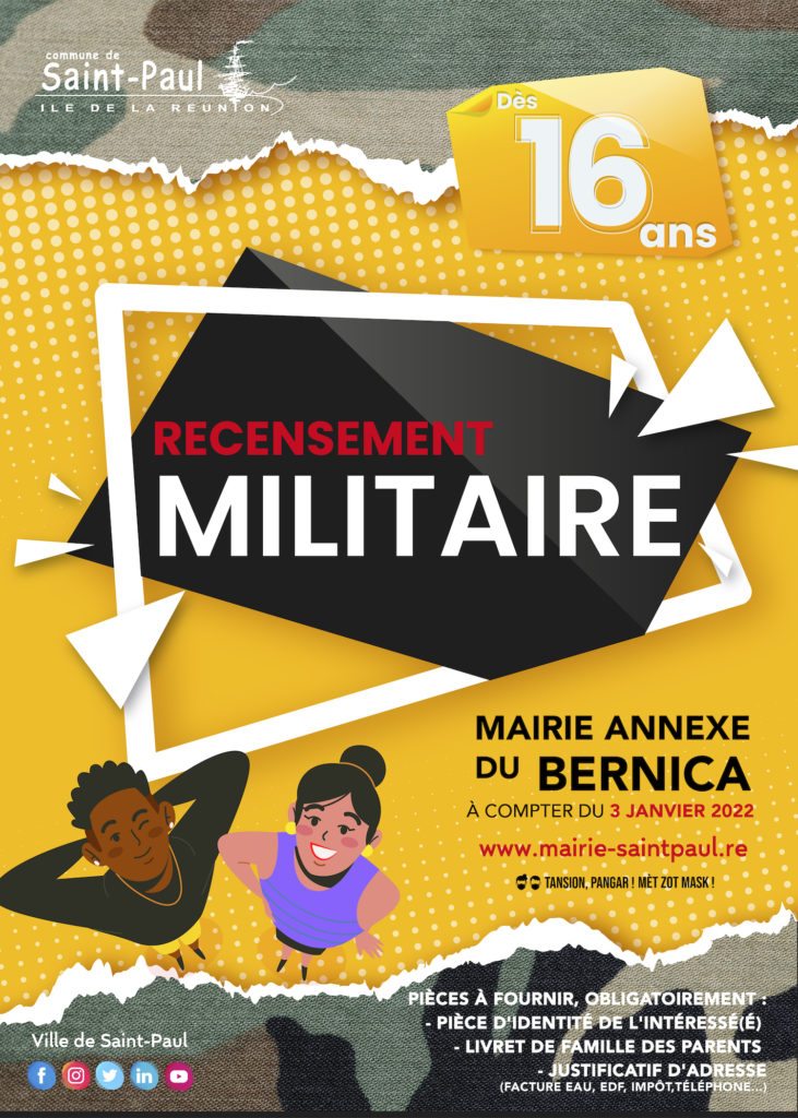 Le recensement militaire ou le recensement citoyen obligatoire, késako? Il s’agit d’une démarche obligatoire et indispensable pour les filles et les garçons âgés de 16 ans pour pouvoir participer à la Journée Défense et Citoyenneté (JDC). Rattaché au Service élection de la Ville de Saint-Paul, le recensement militaire se déroule pour la première fois à titre expérimental à la Mairie annexe du Bernica à partir du 3 janvier 2022. Un service de proximité, au plus près de la population des hauts du territoire, qui concerne tout jeune de nationalité Française, garçon ou fille, doit se faire recenser entre la date de ses 16 ans et la fin du troisième mois suivant. Les Français non recensés peuvent régulariser leur situation jusqu’à l’âge de 25 ans en effectuant volontairement la démarche du recensement.