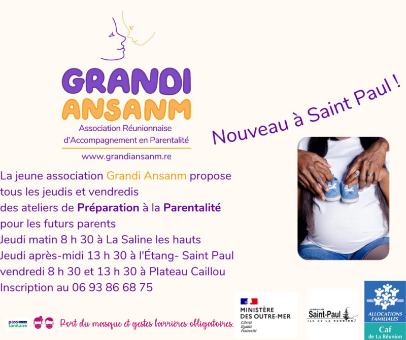 Vous attendez votre premier enfant? Vous vous posez beaucoup de questions sur votre rôle en tant que futurs parents? L’association Grandi Ansanm propose aux futurs parents des ateliers de préparation à la parentalité. Depuis le 9 décembre dernier, cette Association Réunionnaise d’Accompagnement en Parentalité accueille, uniquement sur réservation, les parents à la Saline et à l’Étang Saint-Paul chaque jeudi et à Plateau Caillou chaque vendredi.