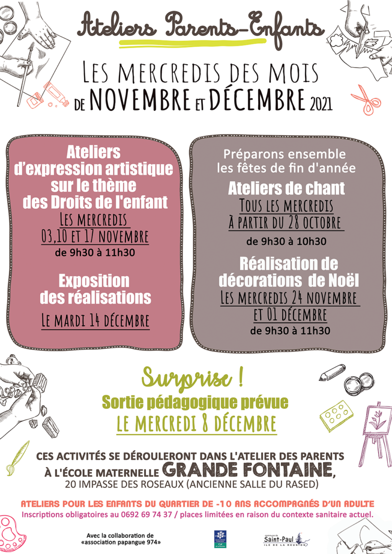 En collaboration avec l’association papangue 974, des ateliers parents-enfants se tiendront du mois d’octobre à décembre à l’école maternelle Grande Fontaine. Ces rendez-vous gratuits réservés aux marmailles du quartier de moins de 10 ans tourneront autour de l’art et des fêtes de fin d’année.