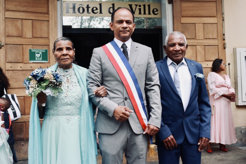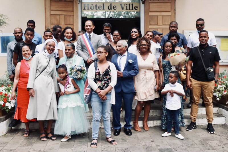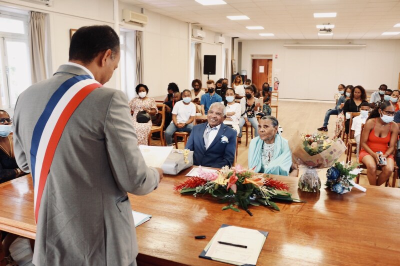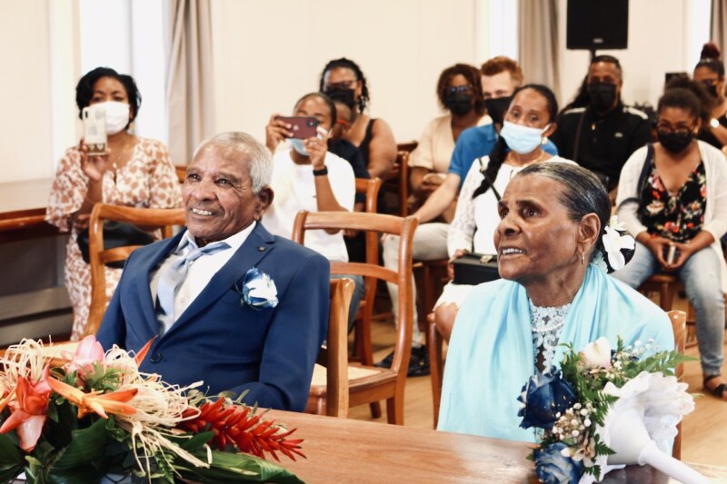 À l’Hôtel de Ville de Saint-Paul le samedi 08 octobre, on s’est apprêté pour accueillir des mariés également sur leur 31. Marc et Yvette RELIQUE, tous les deux 84 ans et nés à 9 jours d’intervalle, sont venus se dire «oui » à nouveau, devant monsieur le Maire, Emmanuel SÉRAPHIN. En présence de 6 des 8 enfants, des petits-enfants, arrière-petits-enfants et tous les proches, c’est avec beaucoup d’émotion et de sincérité que ce moment a été vécu par l’assemblée présente dans la salle du Conseil Municipal. De ces années de maçon, Marc garde le souvenir d’un travail harassant mais qui lui a permis de construire une vie de famille, de nourrir les enfants et de les élever afin qu’ils ne manquent de rien. Yvette a elle aussi contribué à bien faire grandir leurs 4 filles et 4 garçons en s’occupant de la vie à la maison. Aujourd’hui, elle prend plaisir à profiter avec ses petits-enfants et arrière-petits-enfants.