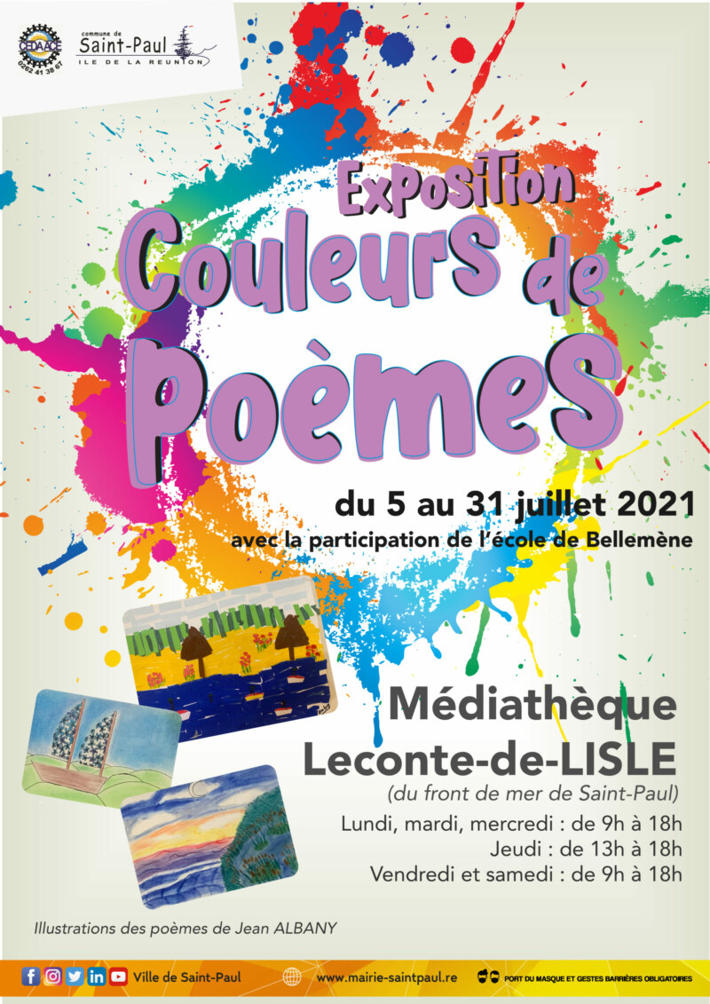 Renouer avec le plaisir de lire, une priorité pour la Ville de Saint-Paul qui vous invite, à travers son réseau de lecture publique, à découvrir jusqu’au 31 juillet 2021, les tableaux des élèves de l’école Bellèmene illustrant les poèmes de Jean Albany à la médiathèque Leconte-de-Lisle . Quand les mots s’expriment et s’illustrent en couleurs, seul l’imaginaire donne vie aux poèmes de Jean Albany, fondateur de la notion ” créolie” , qui en as inspiré plus d’un dans sa quête culturelle basée sur l’identité et les solidarités réunionnaises. À voir et à revoir …..
