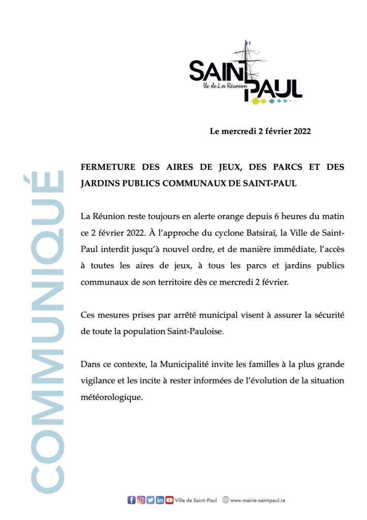À l’approche du cyclone Batsiraï, la Ville de Saint- Paul interdit jusqu’à nouvel ordre, et de manière immédiate, l’accès à toutes les aires de jeux, à tous les parcs et jardins publics communaux de son territoire dès ce mercredi 2 février 2022.
