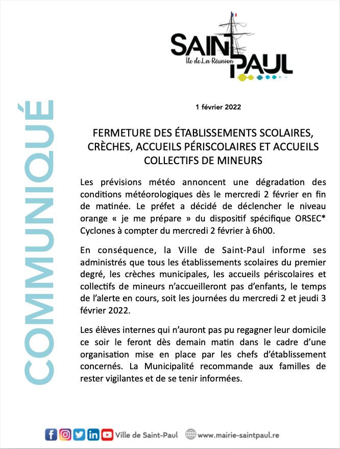 Suite aux prévisions météo qui annoncent une dégradation des conditions météorologiques dès le mercredi 2 février en fin de matinée. La Ville de Saint-Paul vous communique la fermeture des établissements scolaires, crèches, accueils périscolaires et accueils collectifs de mineurs pour les journées du mercredi 2 et jeudi 3 février 2022.