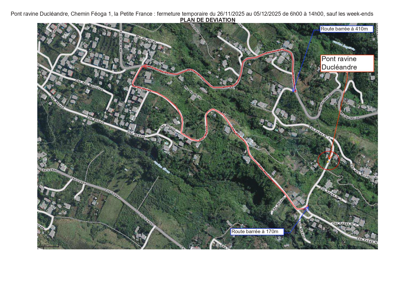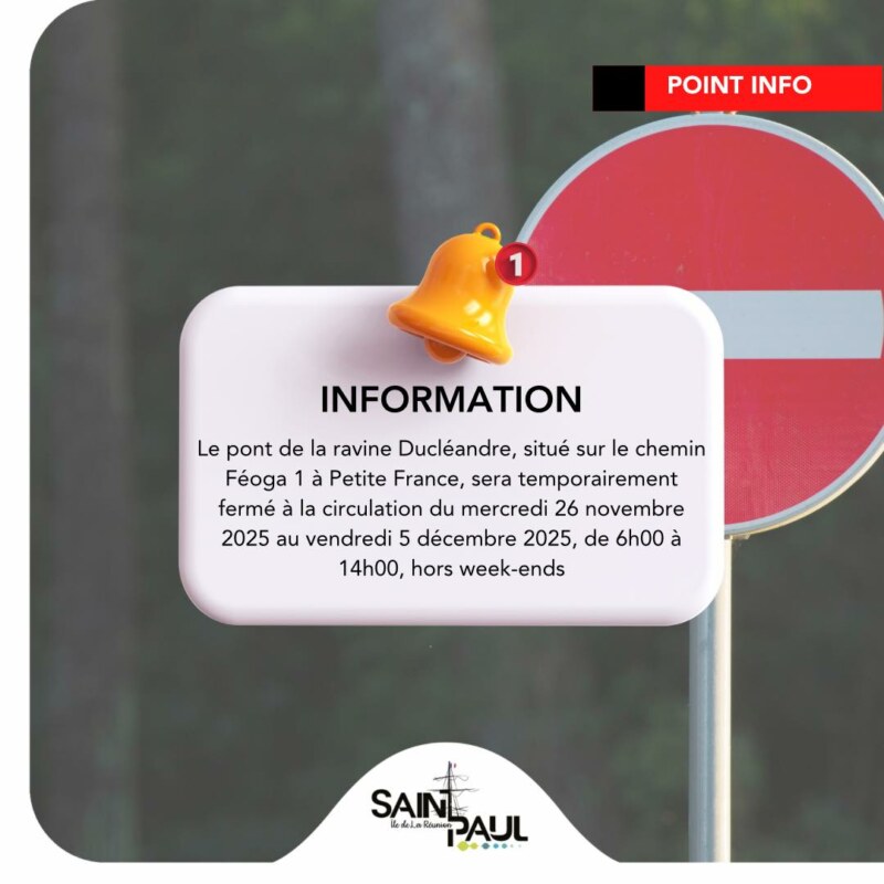 La Ville de Saint-Paul informe les usagers que le pont de la ravine Ducléandre, situé sur le chemin Féoga 1 à Petite France, sera temporairement fermé à la circulation du mercredi 26 novembre 2025 au vendredi 5 décembre 2025, de 6h00 à 14h00, hors week-ends.