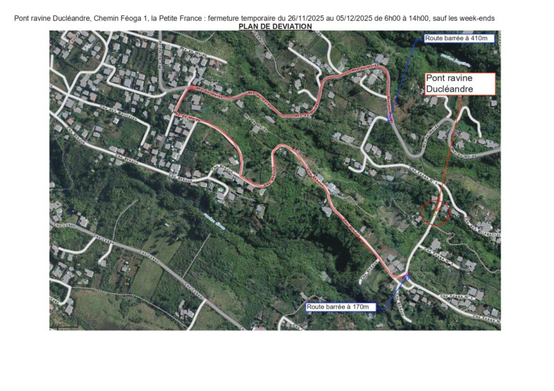 La Ville de Saint-Paul informe les usagers que le pont de la ravine Ducléandre, situé sur le chemin Féoga 1 à Petite France, sera temporairement fermé à la circulation du mercredi 26 novembre 2025 au vendredi 5 décembre 2025de 6h00 à 14h00hors week-ends.