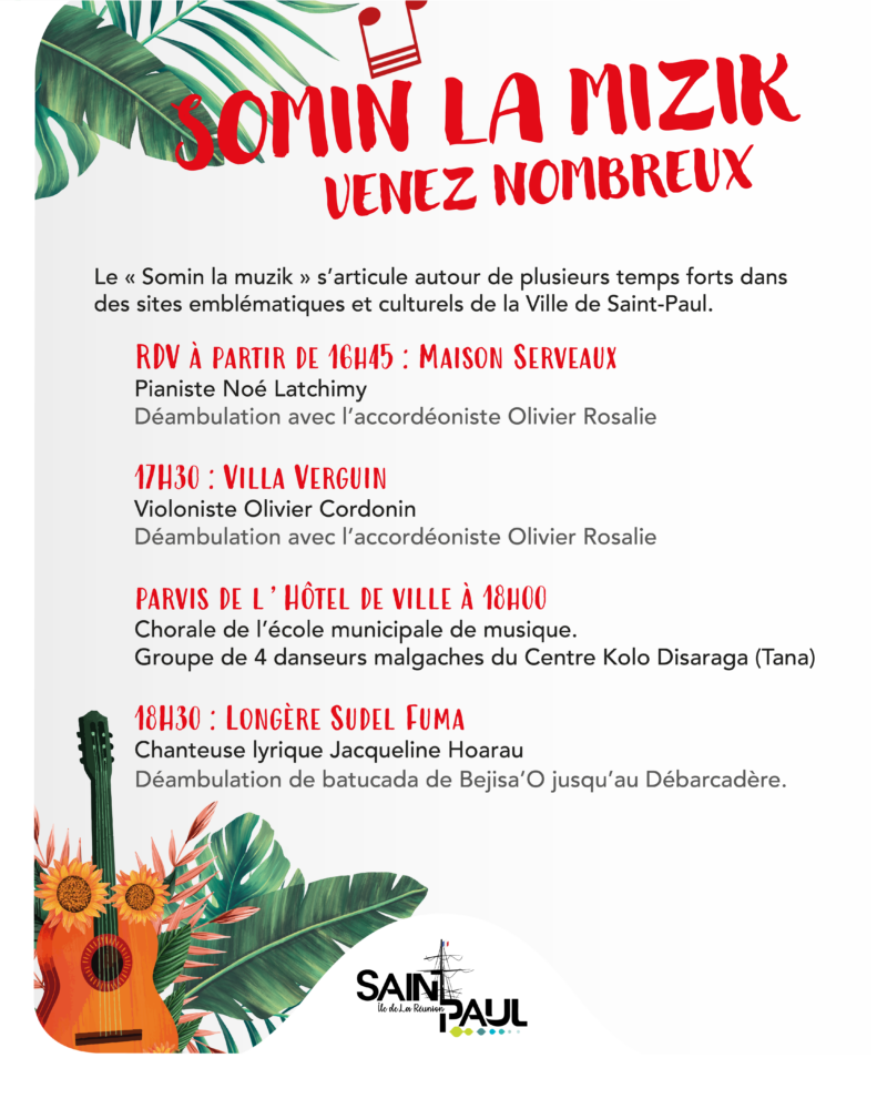Ne manquez pas cette journée exceptionnelle de célébration musicale à Saint-Paul, où chaque coin de la ville résonnera de mélodies et de rythmes divers pour le plaisir de tous les habitants et visiteurs. Venez nombreux pour partager ces moments de joie et de convivialité !