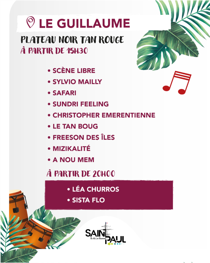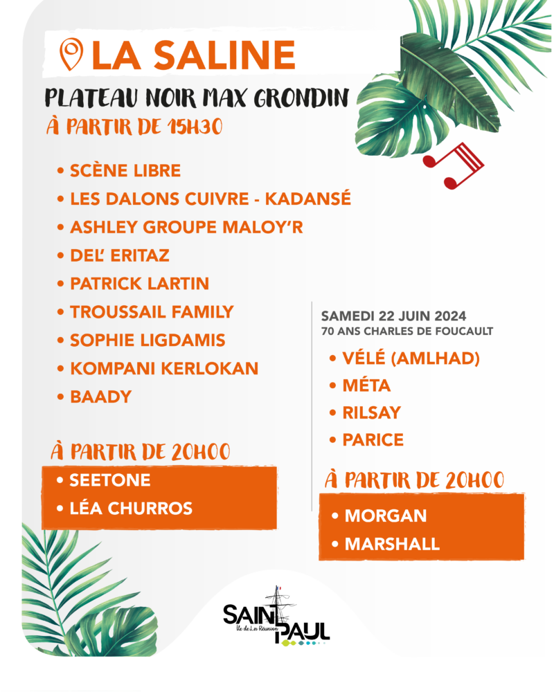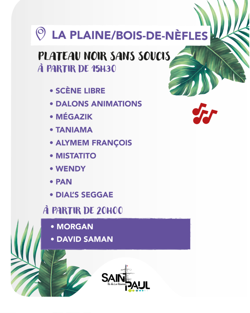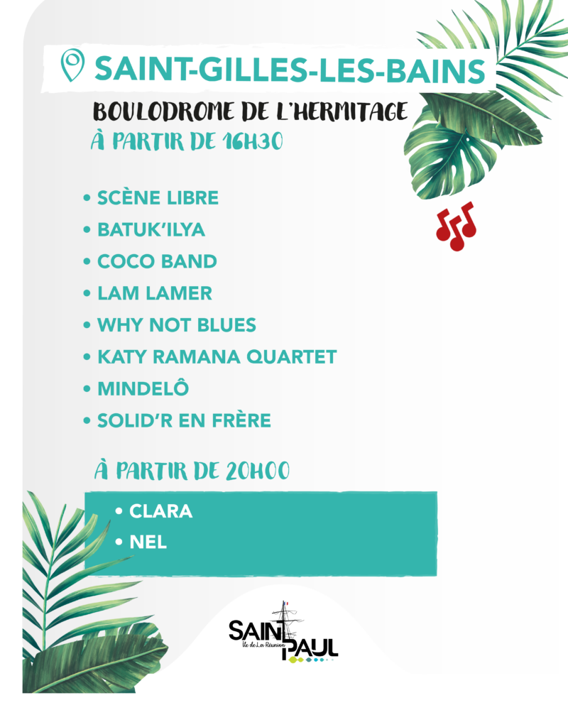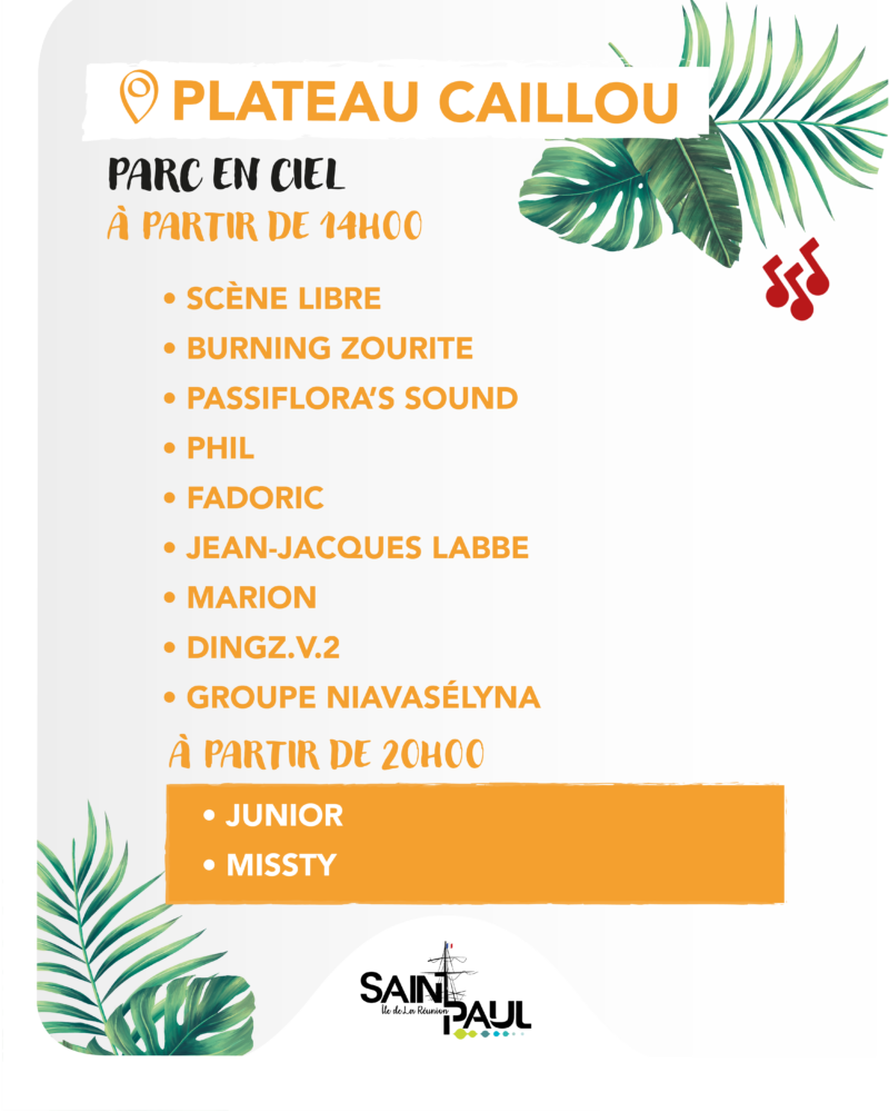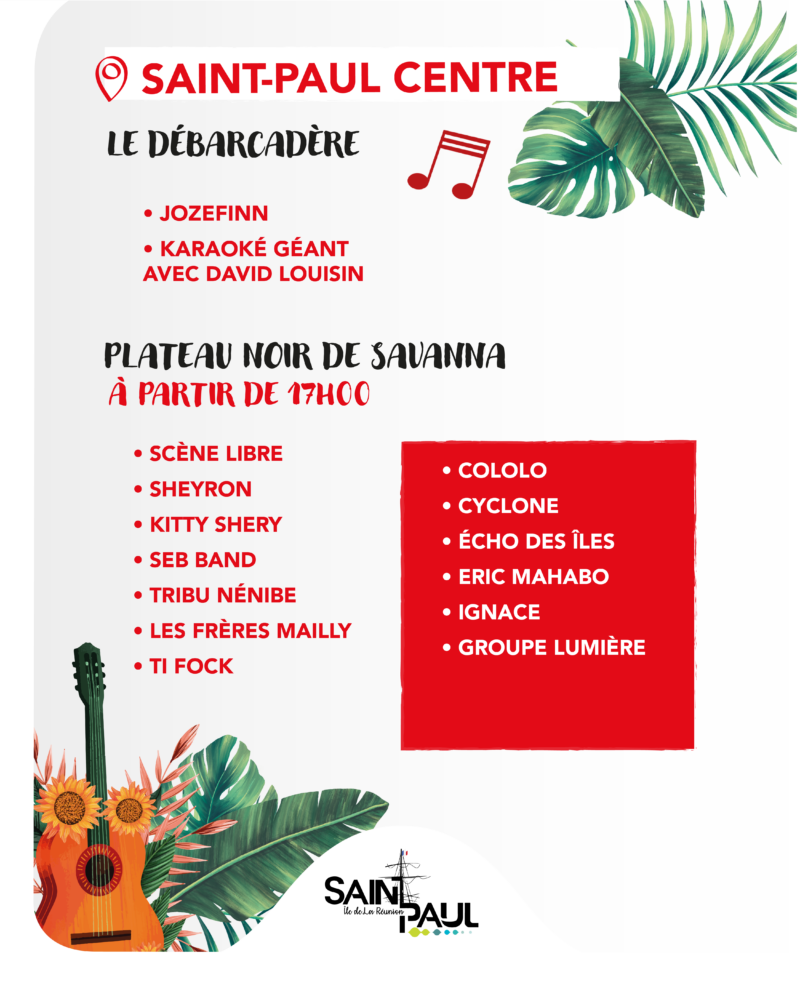 Plusieurs sites de la ville accueilleront des concerts et animations dès la fin de journée. Rendez vous donc au Parc en ciel de Plateau-Caillou, Plateau noir de Tan-Rouge, Plateau noir Max Grondin à la Saline, Boulodrome de l’Hermitage, Plateau noir de Sans Soucis, Plateau noir de Savannah ainsi que sur le Débarcadère. Sur scène des artistes locaux saint-paulois mais aussi des têtes d’affiches de la scène réunnionnaise.