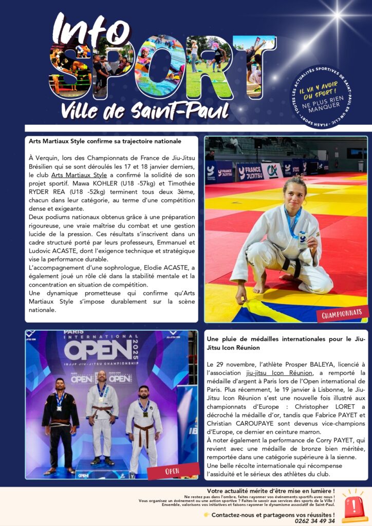 Les clubs saint-paulois continuent également de briller sur les scènes régionales, nationales et internationales. En jiu-jitsu, kick-boxing, badminton ou sports de combat, de nombreux athlètes se sont distingués par leurs performances, illustrant la qualité de l’encadrement et l’engagement associatif local.