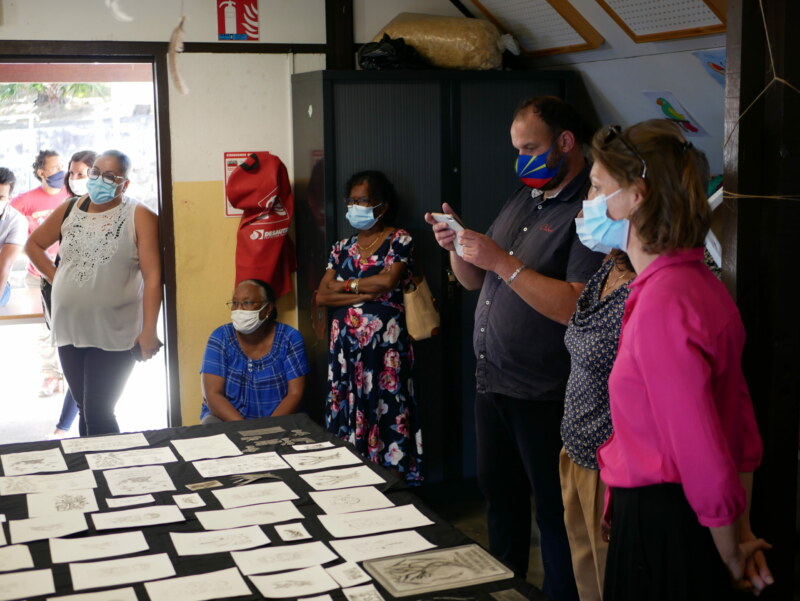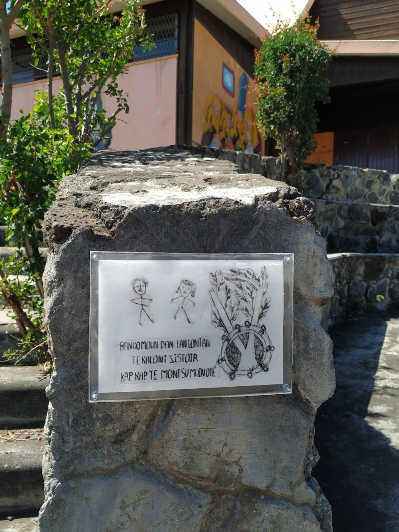 Tout commence sous la forme d’une exploration dans le petit parc que borde la route dans ce quartier de Plateau Caillou. Ce bout de terre, niché au cœur du quartier, se révèle à travers les mots et les récits de ceux qui habitent ce territoire. Pique-nique en famille et glissades sur l’herbe nous évoquent les moments heureux de ce lieu ; et c’est à partir de ce vocabulaire que les participants à l’atelier ont rédigé les “Haïkus”. Ces courtes poésies japonaises de trois vers ont été illustrées à partir d’une technique de gravure dite « en creux » que l’on appelle également « taille douce ». Conçues comme des récits en mouvement, ces diverses compositions ont donné naissance à la réalisation de plaques en résine renfermant chacune une gravure originale. Ces plaques viennent tout juste d’être installées dans le parc public en présence de Karine LEBON, Députée de la 2ᵉ circonscription, Sabine PIERREDON, déléguée du Préfet, Suzelle BOUCHER, 2ème adjointe et déléguée aux affaires culturelles, Perceval GAILLARD, délégué à la politique de la ville et Bernadette MOUNIAMA-CUVELIER, adjointe du quartier de Plateau Caillou. Ces plaques permettent aux visiteurs de découvrir l’histoire unique du quartier Combavas sous la forme d’un mini-parcours.