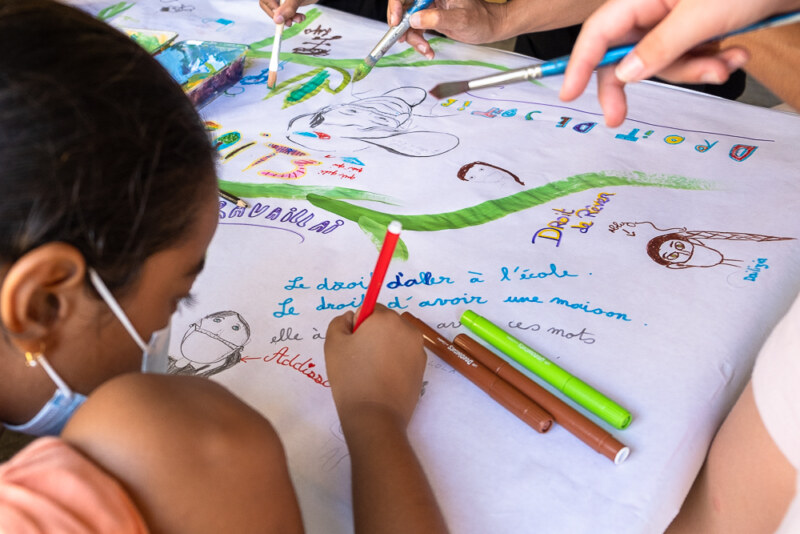 Plusieurs marmays inscrivent également des messages de paix et d’égalité entre les deux sexes sur cette fresque. L’occasion pour eux d’évoquer les droits des Enfants et des Travailleurs. Ces ateliers vont se poursuivre jusqu’au 18 mars pour les ALSH des secteurs de La Saline, de la Saline-les-Bas et du Bernica.