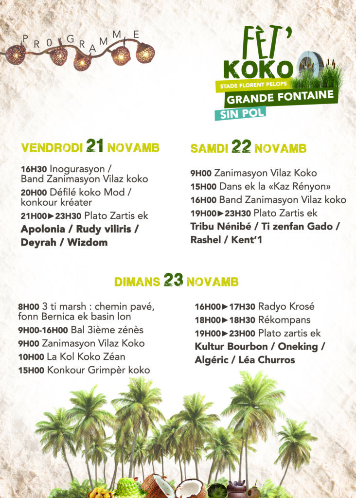 Les associations organisatrices ont décidé à l’unanimité de reporter la Fèt’ koko, initialement prévue ce week-end, en raison des intempéries. Celles-ci communiqueront dès que possible une nouvelle date.