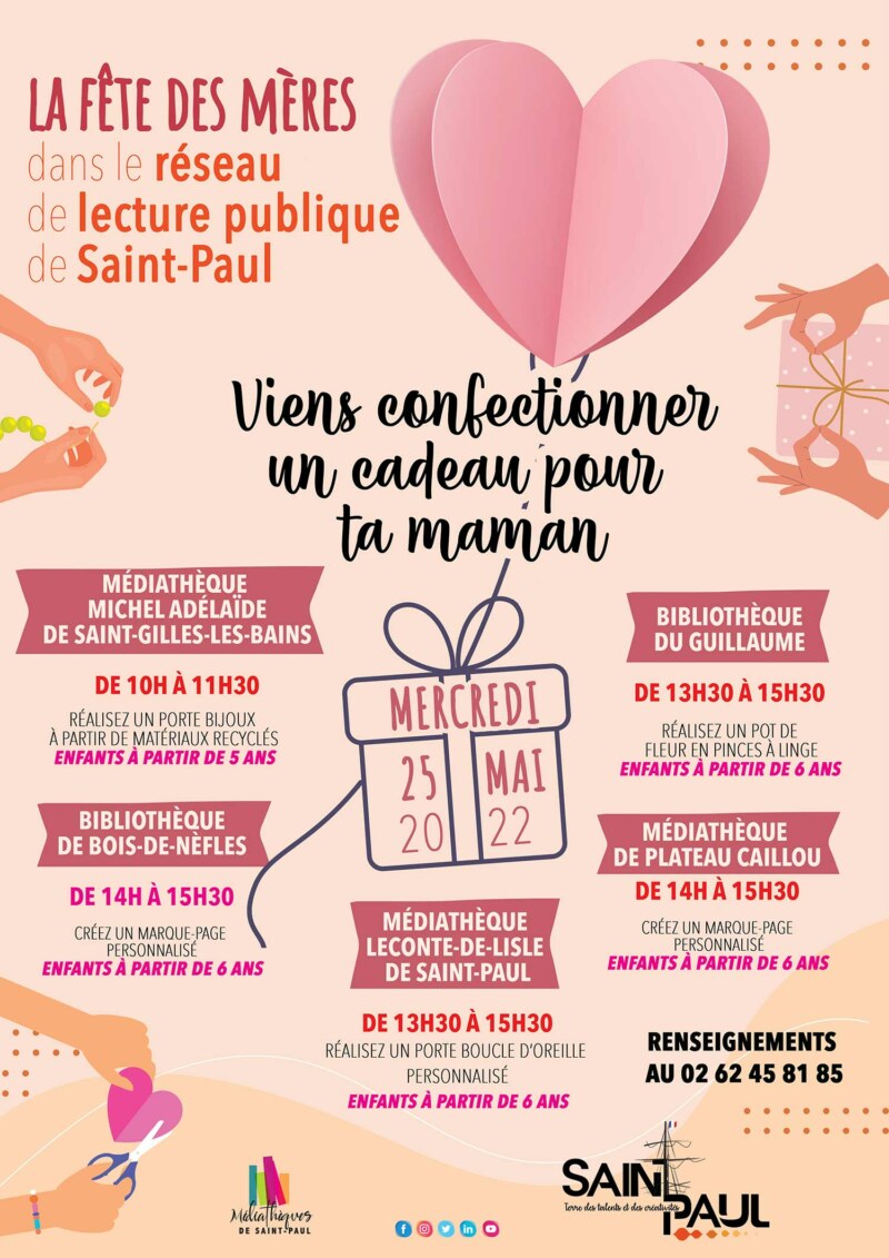Ce mercredi 25 mai 2022, la fête des mères s’invite dans le réseau de lecture publique de la Ville de Saint-Paul ! De multiples ateliers de confection de cadeaux pour Maman attendent les marmay dans les médiathèques et les bibliothèques du territoire. Porte bijoux à partir de matériaux recyclés, marque page personnalisé, porte boucle d’oreille, des animations de fabrication fait main pour les petits créatifs, disponible à partir de 5 ans.