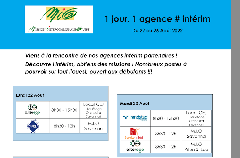 Du 22 au 26 août, la M.I.O (Mission Intercommunale de l’Ouest) organise la manifestation “1 Jour, 1 agence # intérim”. Le concept : le public vient à la rencontre des agences intérim partenaires ! De nombreux postes sont à pourvoir dans l’ouest !
