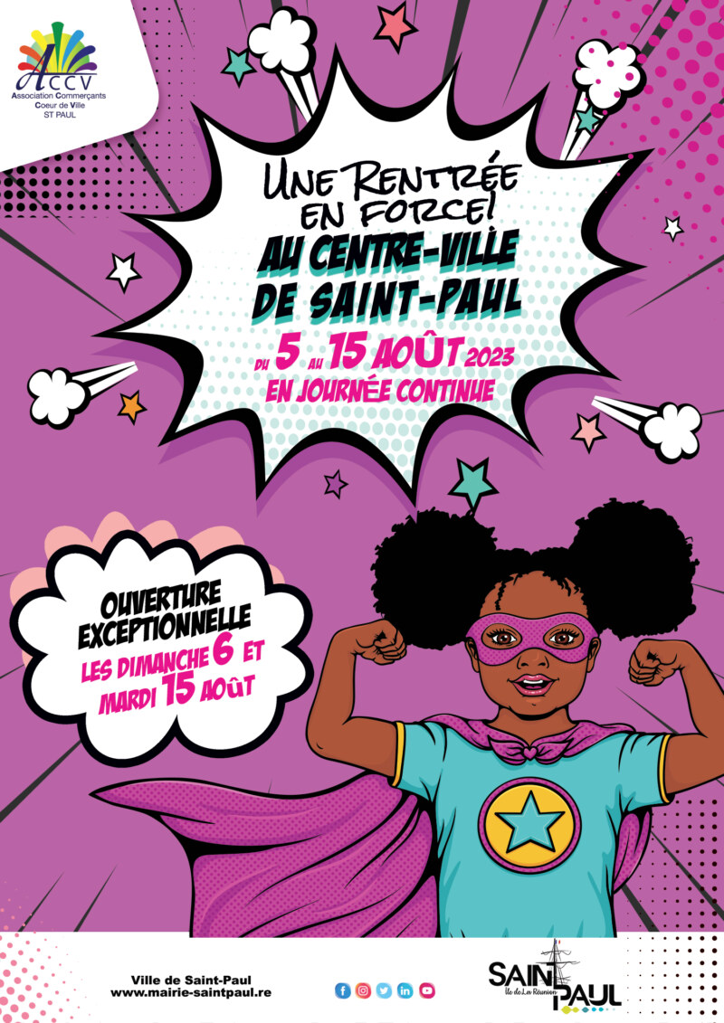 Pour une rentrée en force, les commerçants du coeur de ville de Saint-Paul (ACCV) vous accueillent du 5 au 15 août 2023 en journée continue ! Les commerces seront également ouverts le dimanche 6 et le mardi 15 août. Pour réaliser de bonnes affaires et être au top à la rentrée, rendez-vous à Saint-Paul ! Quand on vous dit que les bons plans c’est par ici !