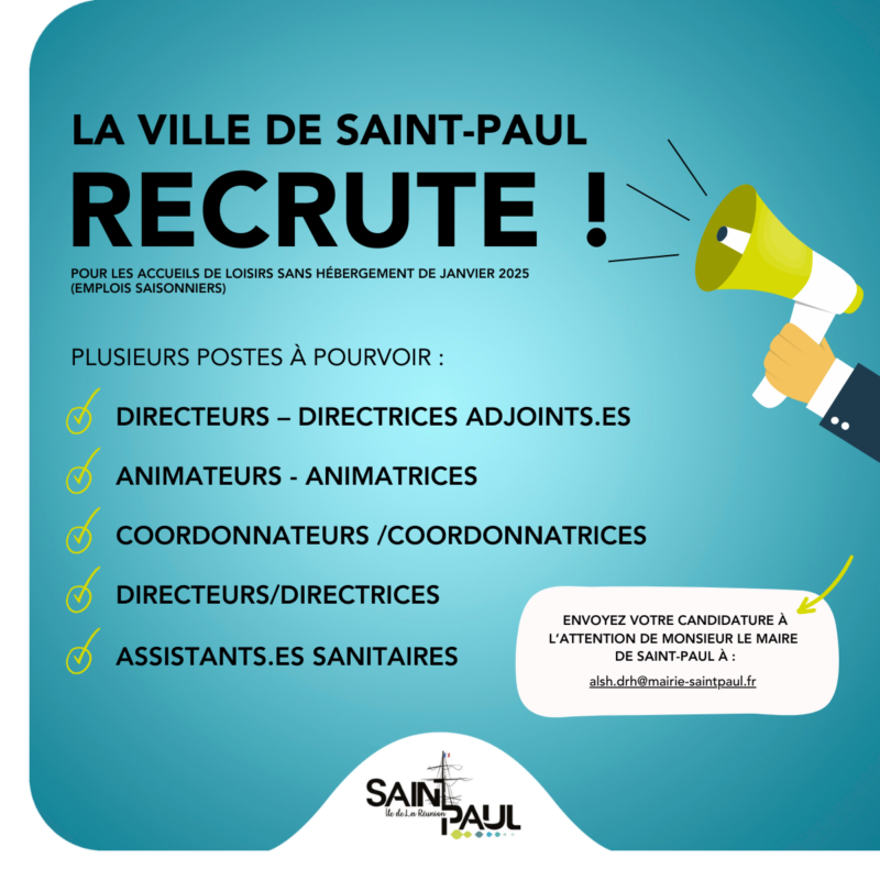 La Commune de Saint-Paul recrute pour les Accueils de Loisirs Sans Hébergement de JANVIER 2025