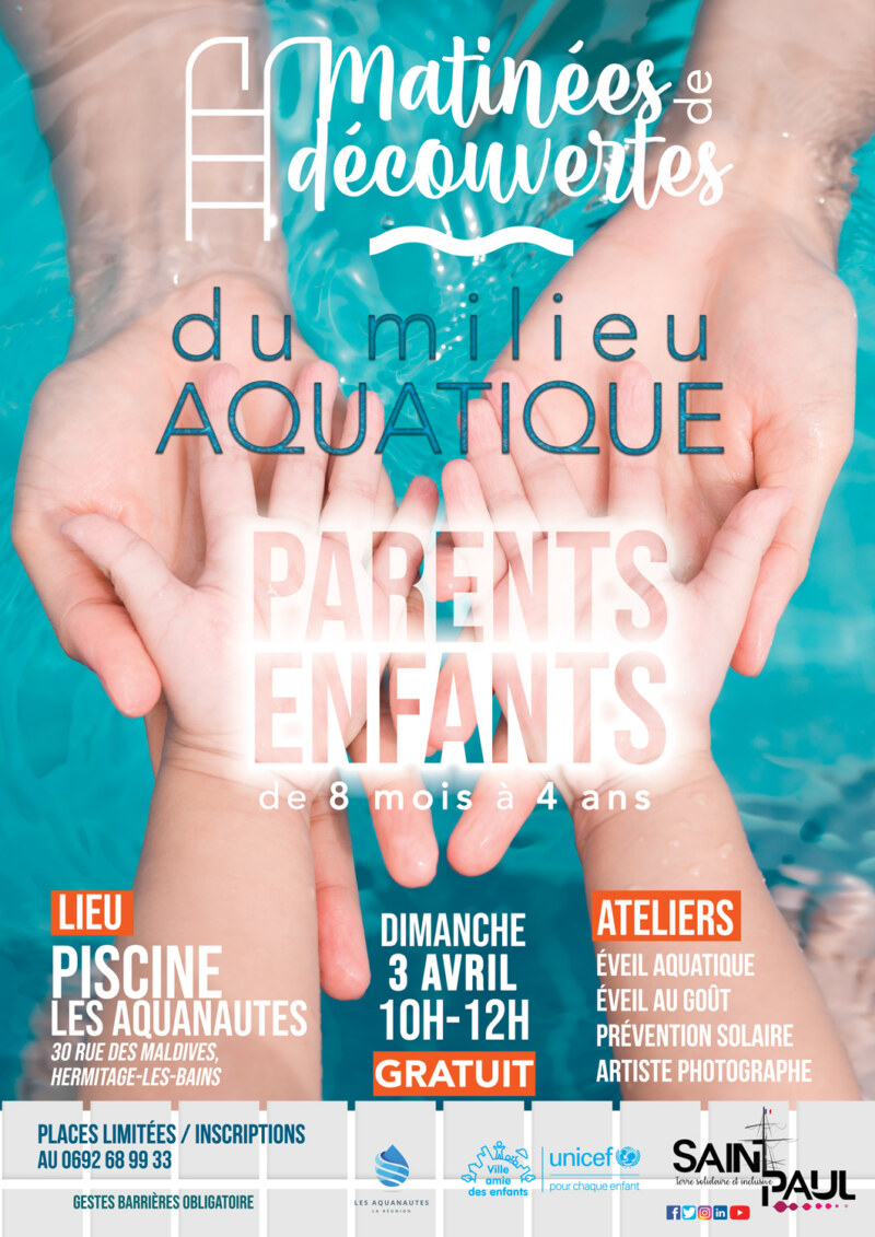 Dédiées aux parents et aux enfants à partir de 8 mois à 4 ans, participez à ce deuxième rendez-vous des “Matinées de découvertes du milieu aquatique” à la piscine les aquanautes, dans le secteur de l’Hermitage-les-Bains, ce dimanche 3 avril 2022. De 10h à 12h, de nombreux ateliers gratuits vous y attendent : éveil aquatique, éveil au goût, prévention solaire… Un artiste photographe sera présent pour immortaliser le moment ! N’oubliez pas votre bonnet de bain ! Attention, les places sont limitées, les inscriptions sont obligatoires sur le site des Aquanautes.