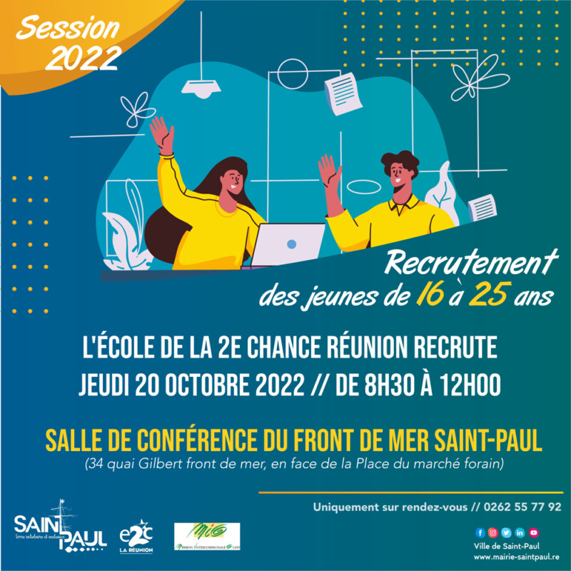 L’École de la deuxième chance tient une session de recrutement ce jeudi 20 octobre 2022, de 8h30 à 12 heures, à la salle de conférence du front de mer de Saint-Paul. Cette matinée va concerner des jeunes âgé·es de 16 à 25 ans. Attention, il faut absolument prendre rendez-vous au 02 62 55 77 92.