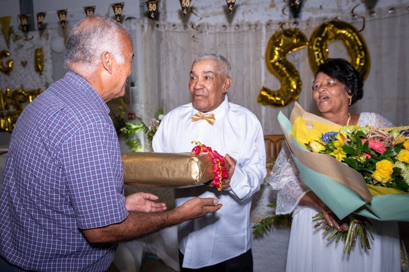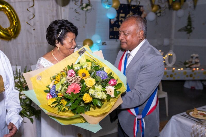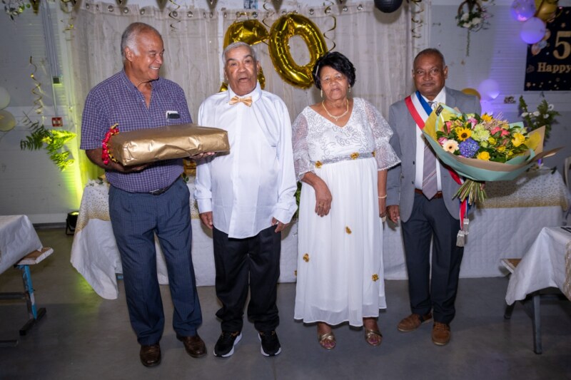 Ce samedi 29 avril, les époux CRESCENCE ont célébré leurs noces d’or en présence de leur famille et leurs proches ainsi que des élus de la Ville, Dominique VIRAMA-COUTAYE et Guyto BELLON. Hector et Gabrielle ont accueilli tout ce petit monde à la salle polyvalente de Corbeil à 18h ! Dans un décor lumineux : or, crème et blanc, le couple saint-paulois a renouvelé leurs voeux et échanger les alliances sous les regards attendris de leurs proches venus spécialement pour l’occasion. Hector et Gabrielle, c’est l’histoire d’une belle rencontre dans le quartier de Tan Rouge, quelques échanges après la messe du samedi soir, et c’était le coup de foudre. Ensemble, le couple aura 9 enfants. Puis, la famille accueille 24 petits-enfants et 8 arrière petits-enfants. On leur souhaite encore beaucoup de belles années à vivre ensemble !