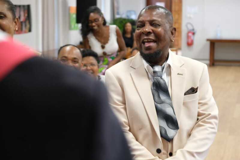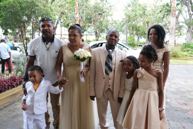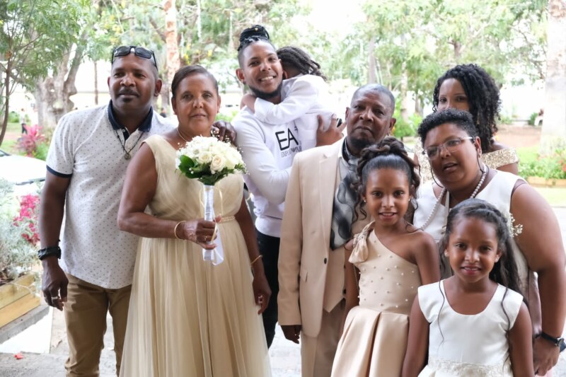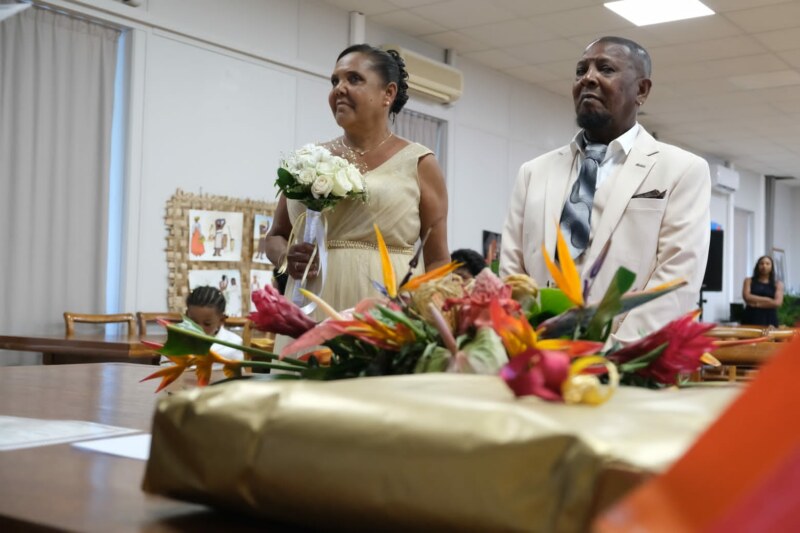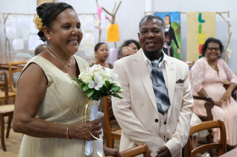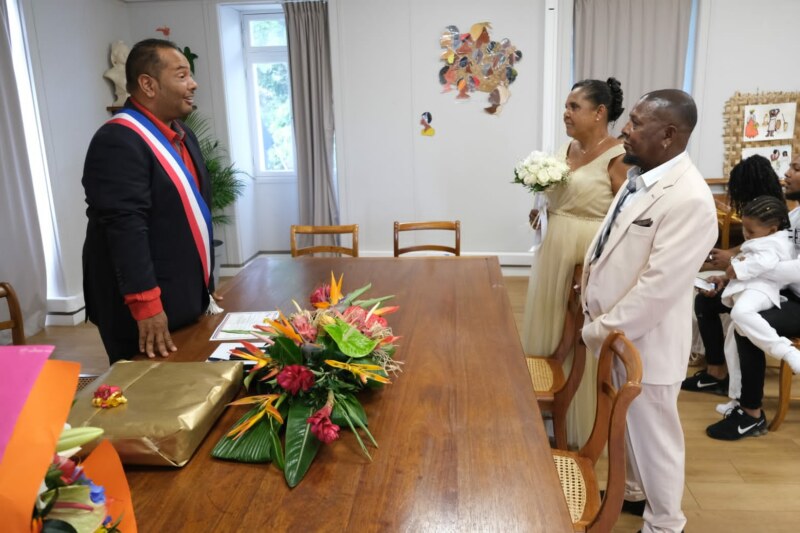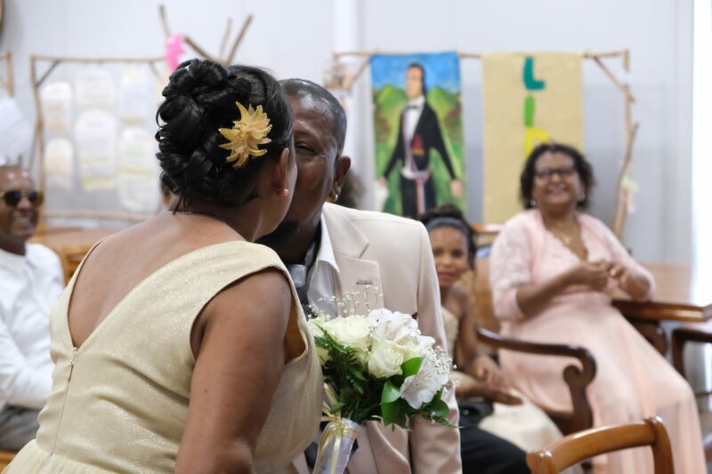 Marie Madeleine SAITY, née le 19 septembre 1954 et Nicolas Emilien MARIE-FRANÇOISE né le 23 novembre 1951, ont célébré leurs noces d’or ce samedi 17 décembre à la l’hôtel de Ville de Saint-Paul. Les époux habitent à Bois-de-Nèfles depuis 39 ans. Il s’est rencontré à Saint-Denis et c’est madame qui a fait le premier pas. Lui, ancien soudeur et madame, agent polyvalent révèlent les secrets de la longévité de leur amour “Il y a des hauts, il y a des bas, nous renouvelons nos voeux pour avoir que des hauts”. La cérémonie de renouvellement des voeux s’est déroulée en présence de l’élu Yann Crighton.
