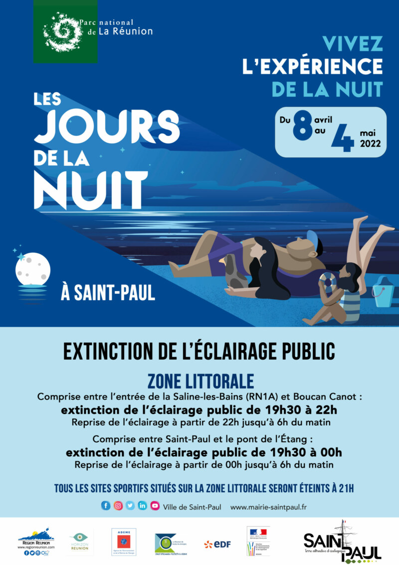 Comme tous les ans, la Ville de Saint-Paul participe à cette opération en procédant à une extinction de l’éclairage public sur sa zone littorale, qui est la zone critique d’échouages. Ainsi du 8 avril au 4 mai 2022, la Ville procédera à l’extinction de son éclairage public selon le dispositif ci-dessous :