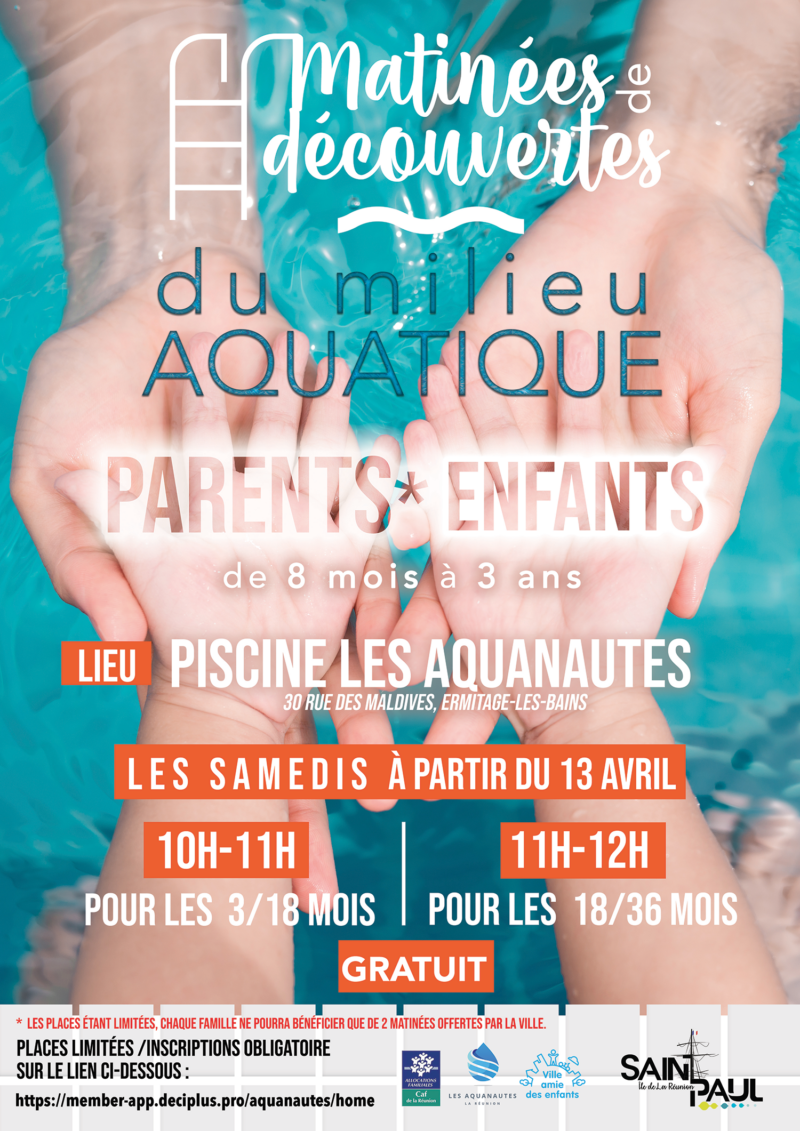Destiné aux parents et aux enfants âgés de 8 mois à 3 ans, cet événement offre de nombreux ateliers gratuits tels que l’éveil aquatique, des ateliers massage, la prévention solaire, le goûter équilibré et un atelier parentalité. Ces ateliers se dérouleront de 10h00 à 11h00 pour les enfants âgés entre 3 et 18 mois et de 11h00 à 12h00 pour les enfants âgés entre 18 et 36 mois.