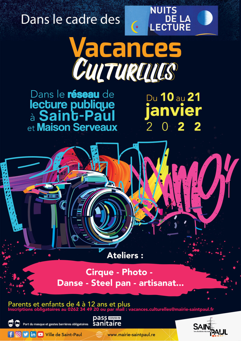 Cirque, photo, danse, steel pan, artisanat, … Dans le cadre des nuits de la lecture, l’opération Vacances culturelles revient du 10 au 21 janvier 2022 à Saint-Paul, Ville d’Art et d’Histoire, dans le réseau de lecture publique à Saint-Paul et la Maison Serveaux.