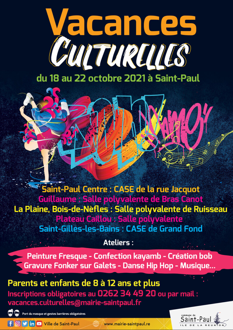 Attention, il faut obligatoirement s’inscrire à chaque atelier au 02 62 34 49 20 ou à l’adresse suivante (vacances.culturelles@mairie-saintpaul.fr). Il n’y aura pas de repas sur place lors des ateliers.