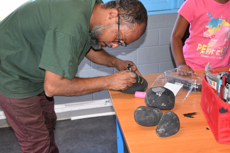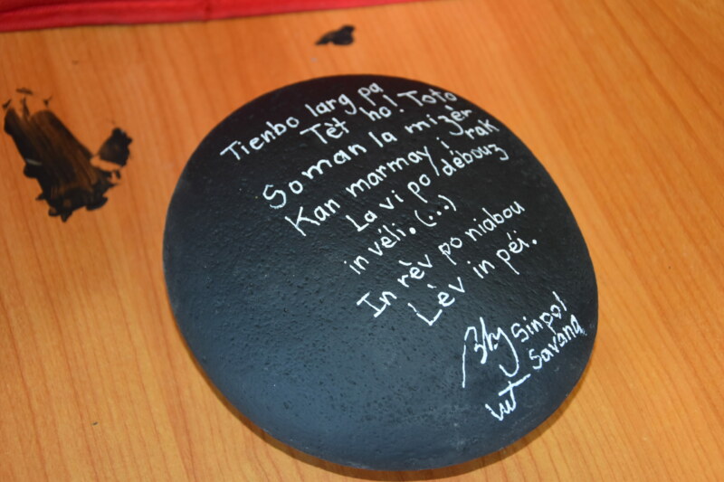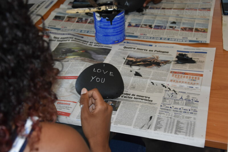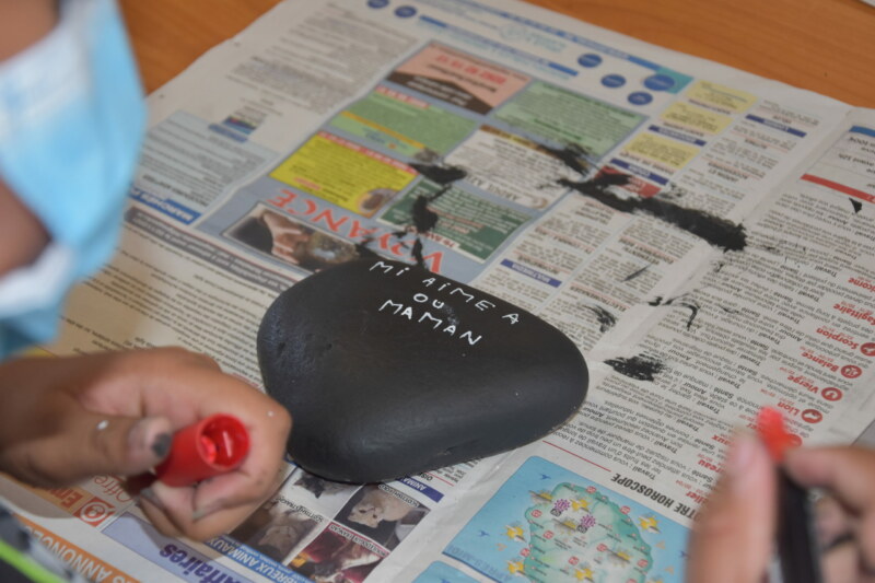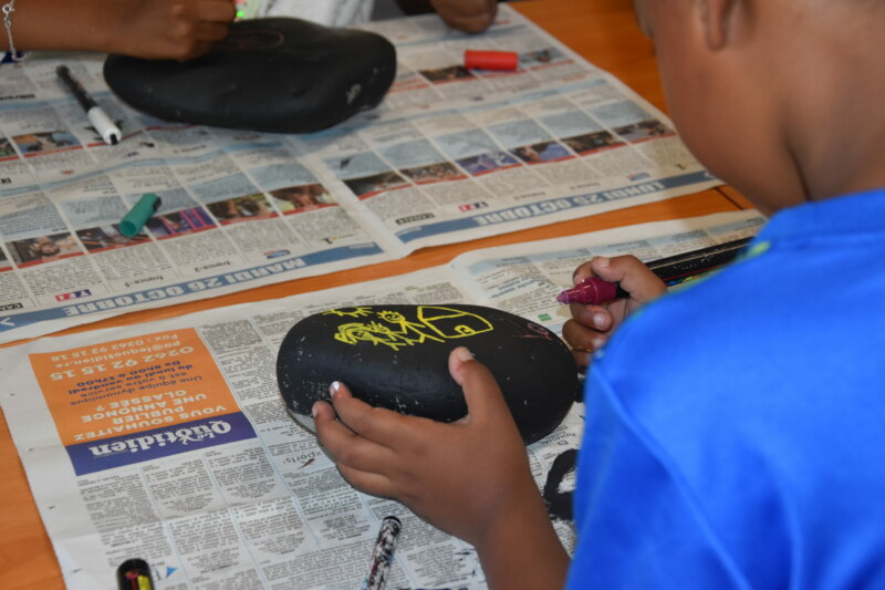 Sur ces galets, les enfants s’expriment avec des feutres, des dessins de fleurs ou de leurs familles, accompagnés de phrases, “Oté La Réunion” ou “Mi aime a ou Maman”. Durant cet atelier animé par l’artiste réunionnais Willy TECHER, alias Babou B’Jalah, nos petits poètes en herbe n’ont pas hésité une seconde à laisser libre cours à leur imagination.