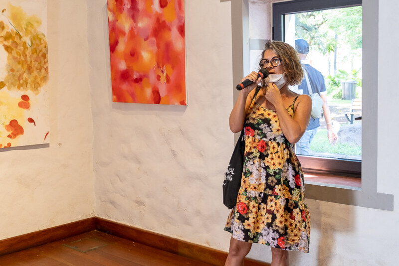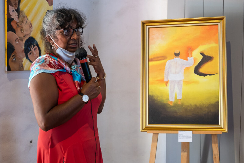 La présentation des œuvres se déroule juste après sa prise de parole. Le vernissage se termine par la prestation de la chanteuse Sundri FEELING.