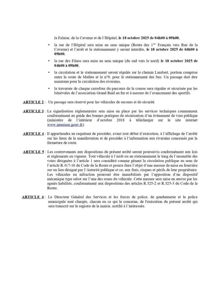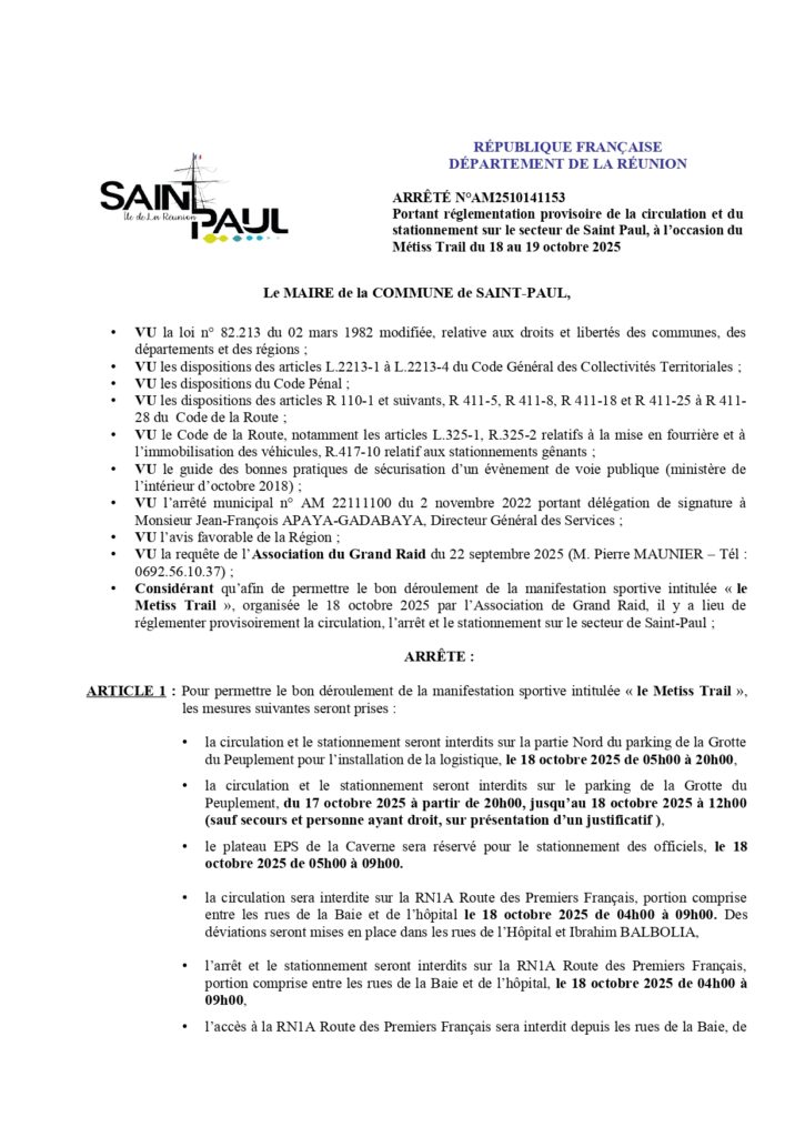 Afin de permettre le bon déroulement du Métis Trail (Grand Raid), organisée le 18 octobre 2025, les mesures suivantes seront prises :