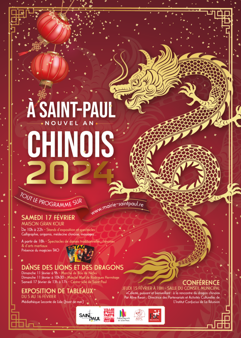 Cette attractivité générée par le Nouvel An Chinois se traduira aussi dans les rues du centre-ville de Saint-Paul avec la danse des lions et des dragons le samedi 17 février de 14 heures à 17 heures.