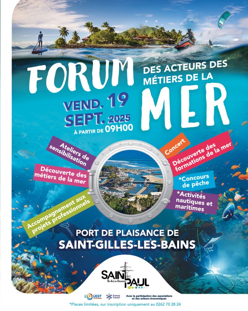 La Ville de Saint-Paul, en partenariat avec le Territoire de l’Ouest – Île de La Réunion (TO) et France Travail Réunion, organise une nouvelle édition du Forum des acteurs des métiers de la mer le vendredi 19 septembre 2025, dès 9h00 au port de plaisance de Saint-Gilles-les-Bains.