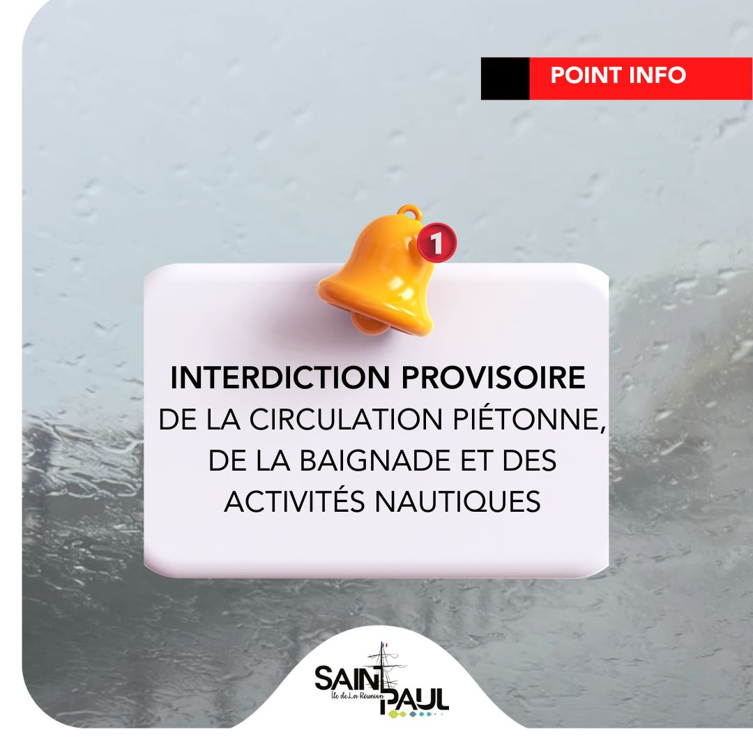 En raison des conditions météorologiques dégradées liées au passage de Fytia et des prévisions de fortes houles annoncées par Météo-France, la Ville de Saint-Paul a pris un arrêté municipal portant interdiction provisoire de la circulation piétonne, de la baignade et des activités nautiques sur une partie du littoral communal Téléchargez l’arrêté Un périmètre concerné étendu Cette interdiction s’applique depuis la Pointe des Galets jusqu’à la Pointe des Trois Bassins. …