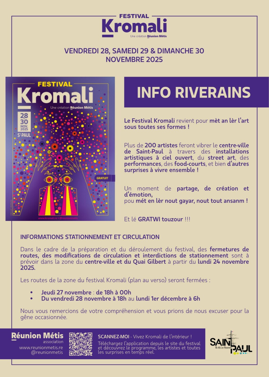 📢 FESTIVAL KROMALI Informations circulations et stationnements à Saint-Paul : mesures provisoires du 24 novembre au 02 décembre 2025 à l’occasion du festival KROMALI.