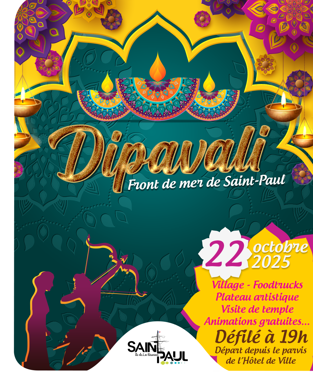 Le front de mer de Saint-Paul s’illuminera le mercredi 22 octobre 2025 à l’occasion de Dipavali, la fête des lumières. Cet événement incontournable, riche en traditions et en couleurs, proposera au public des animations gratuites, un village indien avec foodtrucks et artisans, ainsi qu’un plateau artistique mettant en valeur la culture tamoule. Le défilé débutera à 19h depuis le parvis de l’Hôtel de Ville, suivi d’un spectacle des associations. Les visiteurs pourront également profiter d’ateliers culturels, d’une ambiance musicale …