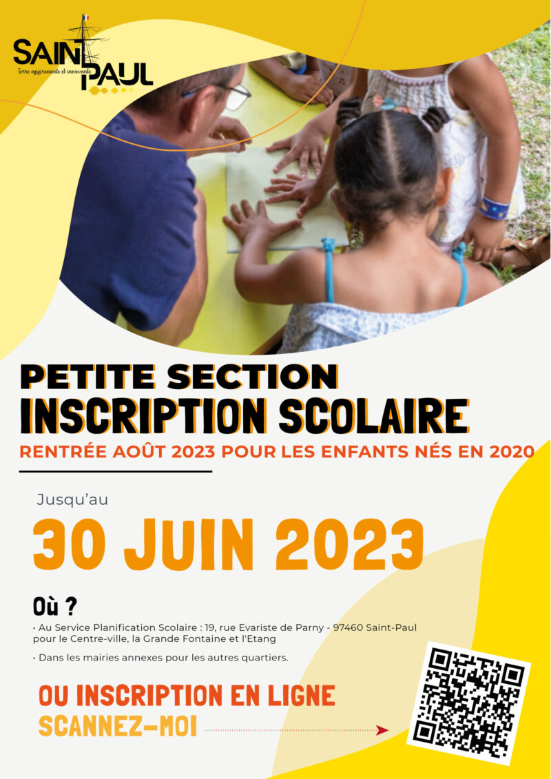 La Commune de Saint-Paul informe les familles qu’un délai supplémentaire est mis en place pour l’inscription des enfants nés en 2020 entrant en petite section à la rentrée d’Août 2023.