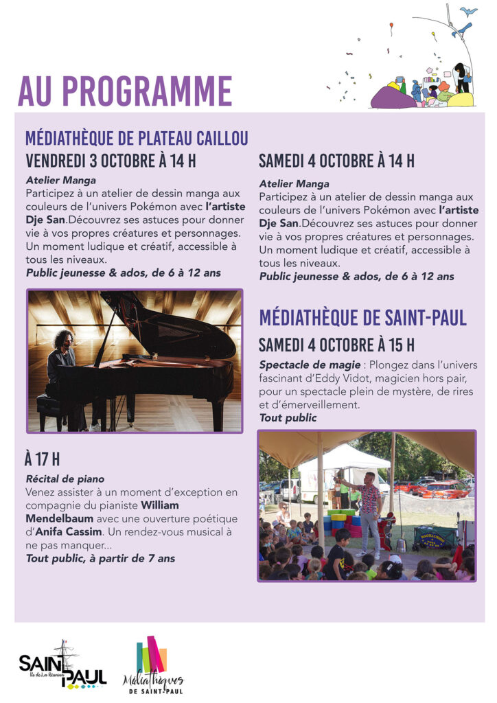 Au programme : ateliers manga pour éveiller votre imagination, récital de piano avec William Mendelbaum accompagné d’Anifa Cassim, ainsi qu’un spectacle de magie avec Eddy Vidot, qui promet rires et émerveillement. Des animations variées et accessibles à tous pour stimuler curiosité et créativité dans une ambiance festive et conviviale.