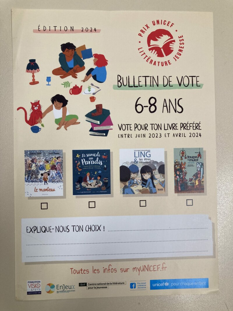 Dès que les 4 albums ont été lus, l’association a procédé au vote. Les enfants ont choisi leur livre préféré parmi les 4 et ont transmis leurs bulletins de vote à Unicef France qui annoncera en juin les livres lauréats 2024 élus par tous les enfants participants.