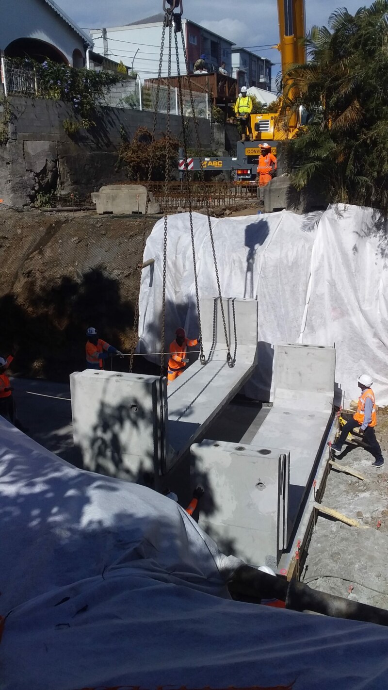 Le radier ravine Jardin traversant la rue de l’Église à Bois-de Nèfles sera remplacé par un pont cadre constitué de plusieurs éléments en béton préfabriqué. La pose de ces éléments nécessite la fermeture provisoire du cheminement piétonnier du 01/08/2023 au 02/08/2023. Un itinéraire de déviation a été mis en place.