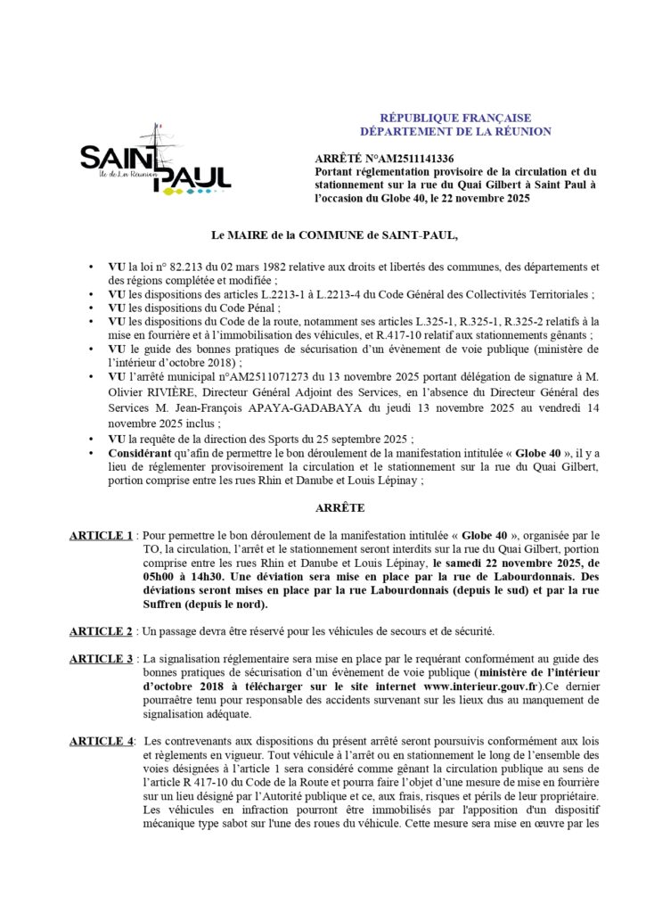 À l’occasion de la manifestation « Globe 40 », organisée par le Tourisme Ouest (TO), la Ville de Saint-Paul informe les usagers que des restrictions de circulation et de stationnement seront mises en place le samedi 22 novembre 2025, afin d’assurer le bon déroulement de l’évènement.